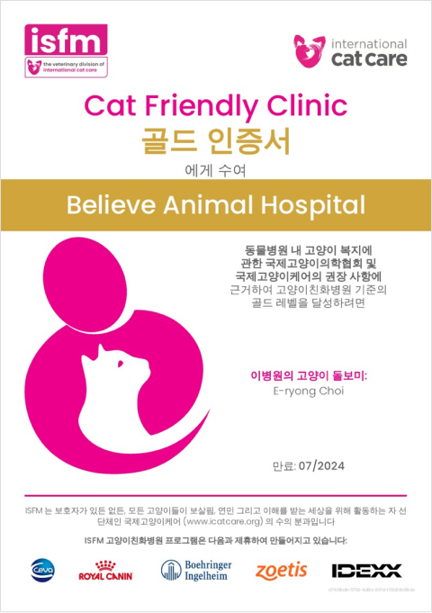 ºô¸®ºêµ¿¹°º´¿øÀº °í¾çÀÌ ¼öÀÇÇа迡¼ °¡Àå ±ÇÀ§ ÀÖ´Â ´ÜüÀÎ ±¹Á¦°í¾çÀ̼öÀÇ»çȸ(International Society of Feline Medicine)ÀÇ °í¾çÀÌģȺ´¿ø(Cat Friendly Clinic) ÇÁ·Î±×·¥¿¡¼ Gold levelÀ» ÀÎÁõ ¹Þ¾Ò½À´Ï´Ù. ISFMÀÇ °í¾çÀÌģȺ´¿øÀÎÁõ ÇÁ·Î±×·¥Àº °í¾çÀÌ¿Í °í¾çÀÌ º¸È£ÀÚÀÇ °üÁ¡¿¡¼ °í¾çÀÌ¿¡°Ô ÃÖ¼±ÀÌ µÇ´Â Áø·á ȯ°æ°ú Ä¡·á ¼ºñ½º¸¦ Á¦°øÇϱâ À§ÇØ ¸¶·ÃµÈ ±¹Á¦ÀûÀÎ ÇÁ·Î±×·¥ÀÔ´Ï´Ù. ºô¸®ºêµ¿¹°º´¿øÀº °í¾çÀÌģȺ´¿ø ÀÎÁõ Ãëµæ°ú ÇÔ²² ±¹Á¦ ±âÁØ¿¡ ºÎÇÕÇÏ´Â ¼±ÁøÈµÈ ÀǷἺñ½º¸¦ Á¦°øÇϱâ À§ÇØ ´Ã ³ë·ÂÇϰí ÀÖ½À´Ï´Ù.